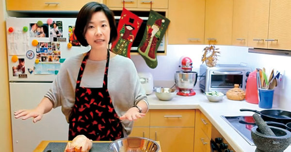 ▲莊祖宜身著家居服,在自家廚房錄製料理製作影音上傳部落格。下圖為她的新書《其實大家都想做菜》。(圖片取自莊祖宜YouTube頻道)