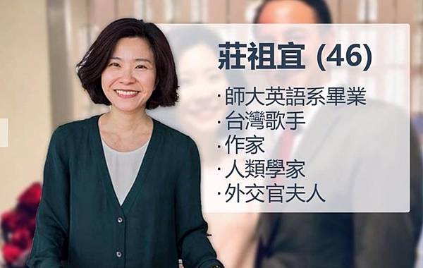 莊祖宜是聲樂家范宇文的女兒,也是美食作家,臉書追蹤粉絲達6萬多人,出過多本料理書籍,會下廚寫作、還出過唱片,彈的一手好吉他。中美撤館風波爆發,她成了爆紅的外交官夫人。
