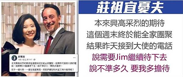 莊祖宜在21日的帖文寫道:「本來興高采烈的期待這個週末終於能全家團聚,結果昨天接到大使的電話,說需要Jim繼續待下去,說不準多久,要我多擔待。孩子一個大哭,一個生氣砸東西,而我們憤怒和失望又有什麼用呢?」
