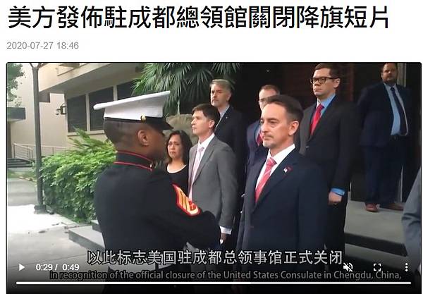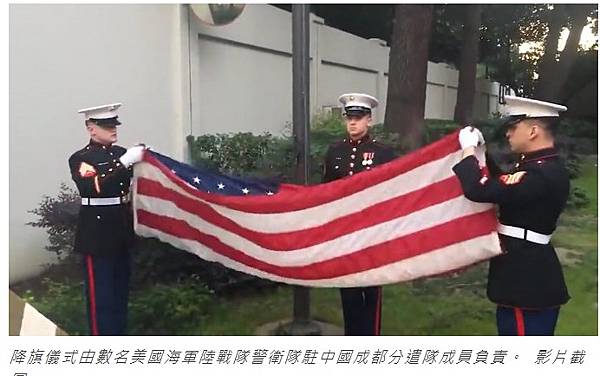 美駐成都總領事館今日按中方要求閉館後,美國駐華使領館的Twitter賬號下午發佈一段降旗閉館的短片。影片見美方舉行降旗儀式,數名美國海軍陸戰隊警衞隊駐中國成都分遣隊成員負責,國旗降下後,成員將之轉交美國駐成都總領事林杰偉,並稱國旗「退役」,標誌總領事館正式關閉。
