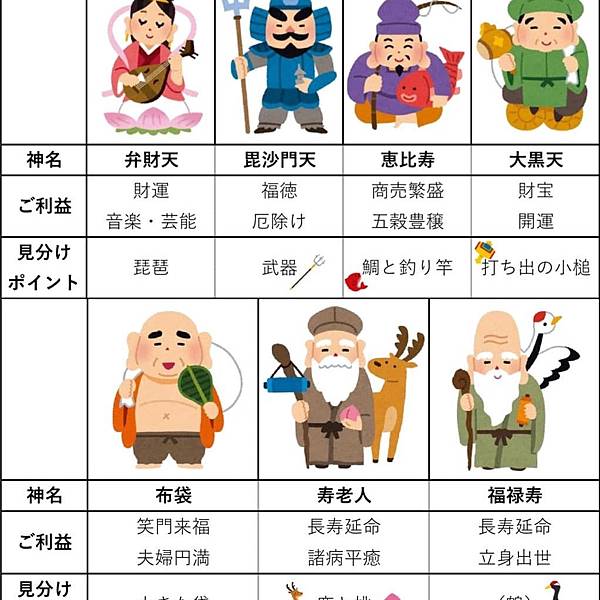 七福神是在日本信仰中被認為會帶來福氣、財運的七尊神明,一般以惠比壽、大黑天、毘沙門天、壽老人、福祿壽、辯才天、布袋為七福神,整體形象類似中國的八仙。