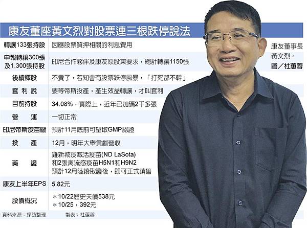 2007年,黃文烈砸下約20億元買下中國安徽六安華源製藥,後改名為康友,六安華源是中國第六大疫苗、輸液廠,2015年康友以海外第一上市方式返台掛牌,後來他看準動物疫苗產業,轉進印尼設立帝斯生技,生產開發禽流感疫苗,康友股價一度飆上538元,成為台股股后、生技股王。