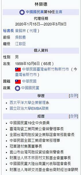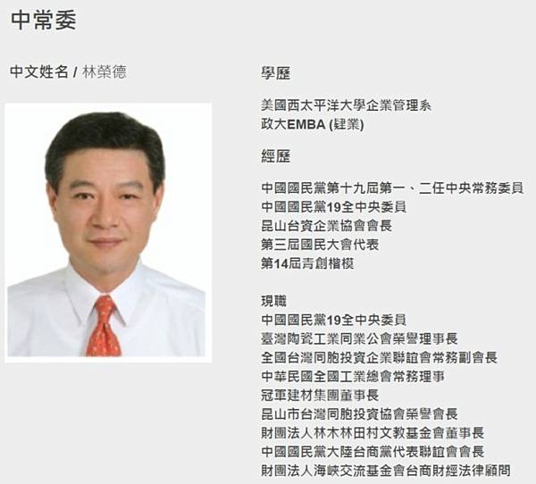 1990年,林榮德接任冠軍建材董事長,並開始將事業發展至中國大陸,並長期擔任中國國民黨中央常務委員。中國國民黨在2020年中華民國總統副總統及立法委員選舉大敗後,使原黨主席吳敦義與一級幹部總辭,後中常會會議中決定互選產生代理主席,最後推選由林榮德出任。林榮德 (政治人物) - 維基百科,自由的百科全書 https://bit.ly/3BYiJb1