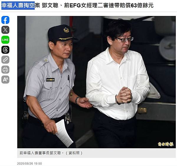 幸福人壽掏空案 鄧文聰、前EFG女經理二審連帶賠償63億餘元 - 社會 - 自由時報電子報 https://bit.ly/4lNcojR
