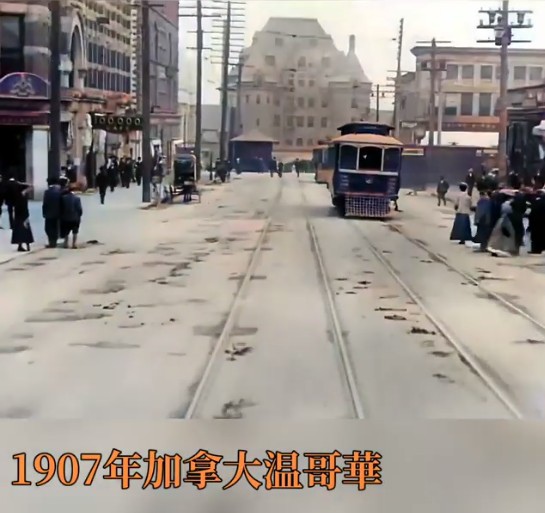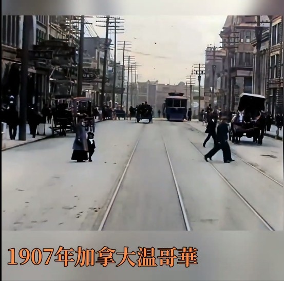 1907年 #113年前加拿大溫哥華街景 馬路上主要 #紳士淑女 #狗 #馬車 #電車 #單車 #少量汽車 (馬路上也有不少馬糞)。