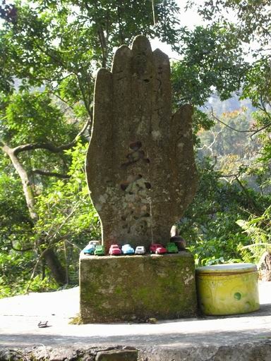 座落在亂石堆起的基座上,高2尺5寸5分、手掌形狀的紀念碑正面刻著5位罹難孩童的姓名與年紀,背面則是立碑人宮川保之以筆名「野艸庵一水」題下的沈痛詩文:「砍斷五指同血淚、五指山下五子悲」,立碑時間是事件發生後3年。紀念碑的基座上,有到訪者留下的各種玩具小汽車、小鐵桶裝的零食,還有三義的木鴨子等等玩具,是獻給這些罹難孩童的,我與L君也拿出水果略表心意。