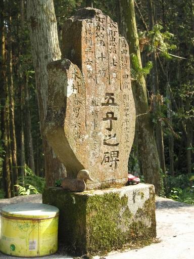 過橋到溪谷西岸,沿山腰繞一段路,路旁有人工疊砌的石造駁坎,心想這路八成與隘勇線有關,一面定位、一面照相,眼前又出現一塊巨石,上面鑲嵌著小石板寫道「五子之碑」與指向溪床的箭頭。兩人下溪床,是一處合流點,沿溪上溯一小段,並於兩岸找路未果,又退回合流點,這次找到路了,在溪對岸(東岸)。