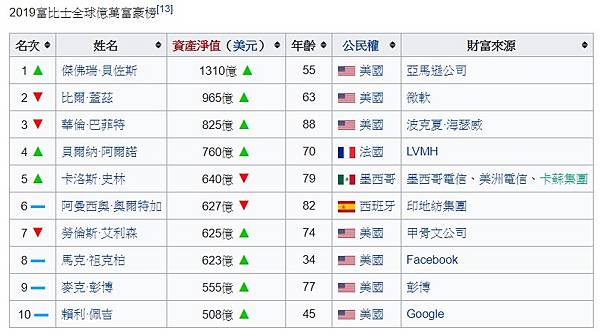全球富豪榜(英語:The World's Billionaires)是美國商業雜誌《富比士》自1987年3月起,在每年3月發布的全球最富有人物的年度排行榜。[1]排行榜上每位人士的資產淨值是根據他們的資產與債務來做估計,並以美元表示。皇族及獨裁者等財富來自於他們的身分地位者將不包含在此排行榜中。[3]此排行榜僅登入實質申報之財產,若其財富來源不明者將不被採計。[4]全球富豪榜 - 維基百科,自由的百科全書 https://bit.ly/3gpgmxy