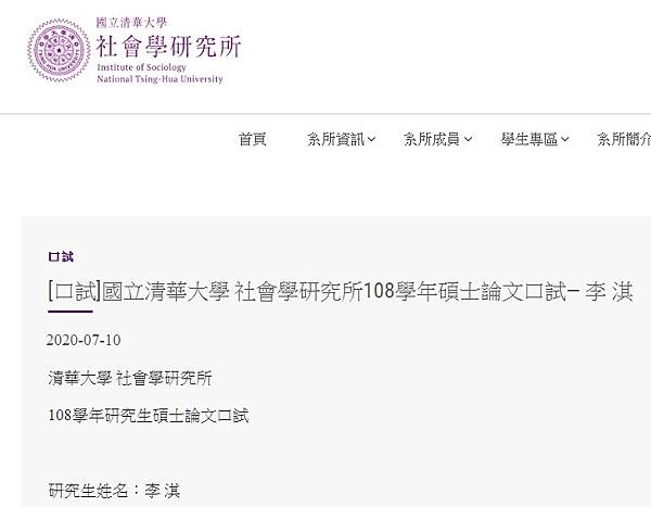 [口試]國立清華大學 社會學研究所108學年碩士論文口試— 李 淇 – 國立清華大學社會學研究所 https://bit.ly/34CkVCn