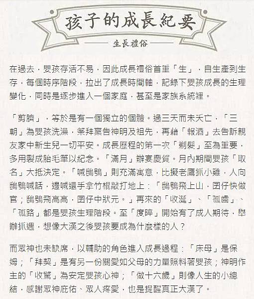 在過去,嬰孩存活不易,因此成長禮俗首重「生」,自生產到生存,每個時序階段,拉出了成長時間軸,記錄下嬰孩成長的生理變化,同時是逐步進入一個家庭,甚至是家族系統裡。