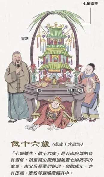 「做16歲」是著名的台式成年禮,一般常見是拜七娘媽,但也會拜其他神明,如同樣是婦女孩童守護神的臨水夫人。