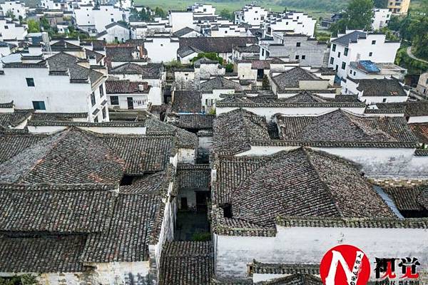 村落里的古民居屬於典型徽州民居建築,每個建築的外觀是大面積空白的一片粉牆,粉牆上嵌有幾個高低有序的小小洞窗,形成整體與局部、點與面的對比效果,充分體現徽派建築「道法自然」的意蘊,這些民居無論是古代還是近代的仿古式,整體色彩效果黑白相間,散發出一種強烈而優美的韻律,給人樸素淡雅的美感。