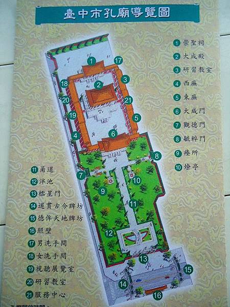 [台中孔子廟]位於台中市北區,孔廟建地總面積為 23,653.20平方公尺,建築物總面積為 2,363.88平方公尺,因是台灣少有的宋代古典建築式,結構複雜多變,裝飾繁疊細緻,在施工上如混凝土之澆灌,由模板組立志鋼筋排紮,每一細步皆經精確校正,外表粉飾裝修,更是精工細琢。各殿宇彩繪亦全採宋式之建築,以捲草花卉為主,用顏色的深淺來描繪造型,施作相當細膩繁複,為台灣少有的建築典範,深值研究與欣賞。整體建築群包括:道貫古今與德侔天地牌坊,照壁,櫺星門,池畔前院,觀德門,毓粹門,燎亭,瘞所,大城門,大成殿,東廡,崇勝祠等,為全臺最完備的孔廟之一。孔廟雖是鋼筋混凝土的新建築,然建築詞彙與元素皆引用曲阜,例如觀德門,毓粹門,有別於閩南式的建築禮門,義路等,整體建築復古精神與形象表達,堪稱是中國古典式樣新建築的先驅。