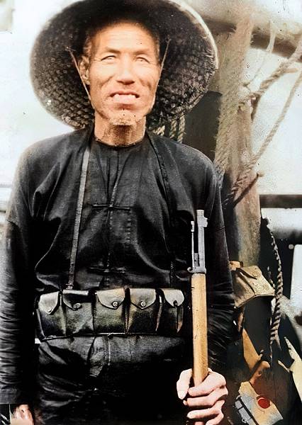 照片上的海盜來財山,頭部剃髮,人坐在船艙裡,略低頭,左手扶槍。