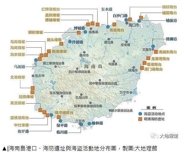 ▲|海南島港口、海防遺址與海盜活動地分布圖,製圖:大地理館