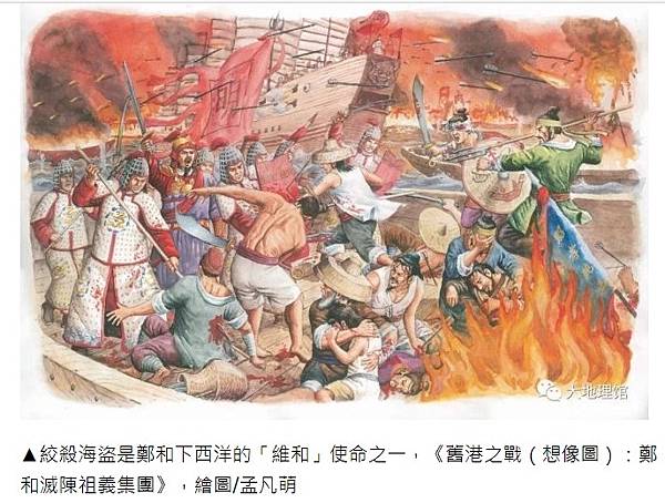 ▲絞殺海盜是鄭和下西洋的「維和」使命之一,《舊港之戰(想像圖):鄭和滅陳祖義集團》,繪圖/孟凡萌