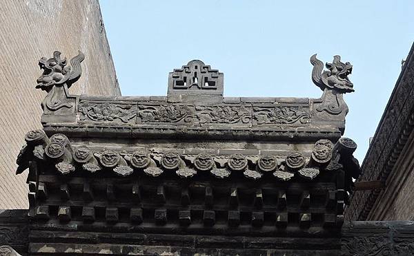 ▲渠家大院牌楼,牌楼巍峨壮观,眺阁玲珑精致,院院之间有过厅,牌楼相隔,层次分明,活泼有趣。屋内屋外彩绘华丽,堆金沥粉。木、石、砖雕俯仰可见,题材广泛,寓意祥和,刀法精良。建设部专家郑孝燮先生由衷地赞叹,渠家大院的每一个建筑构件都是不可多得的艺术品,是当之无愧的传统民居瑰宝。三进院倒座二楼护栏砖雕,采用平面浮雕手法。