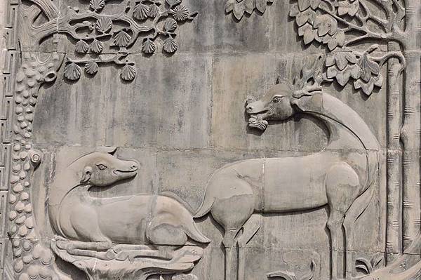 五進院磚雕花牆為平面浮雕,正門雕有鹿和梧桐,背面雕有松鶴和松樹,鹿為仙獸,諧音六;鶴為仙禽,諧音合,與梧桐、松樹組合,寓意"六合同春"。 六合指天地和東西南北,意為處處充滿楊春祥和之意。