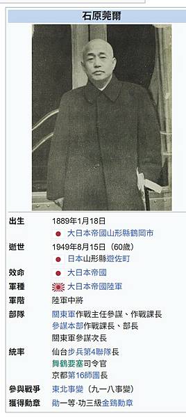 石原莞爾 いしはら かんじ,1889年1月18日-1949年8月15日),生於日本山形縣鶴岡市,日本帝國時代的陸軍中將,日軍侵略戰略的規劃者、理論家。日本思想家、政治家,軍國主義鼓吹者。有日本第一兵家之稱。