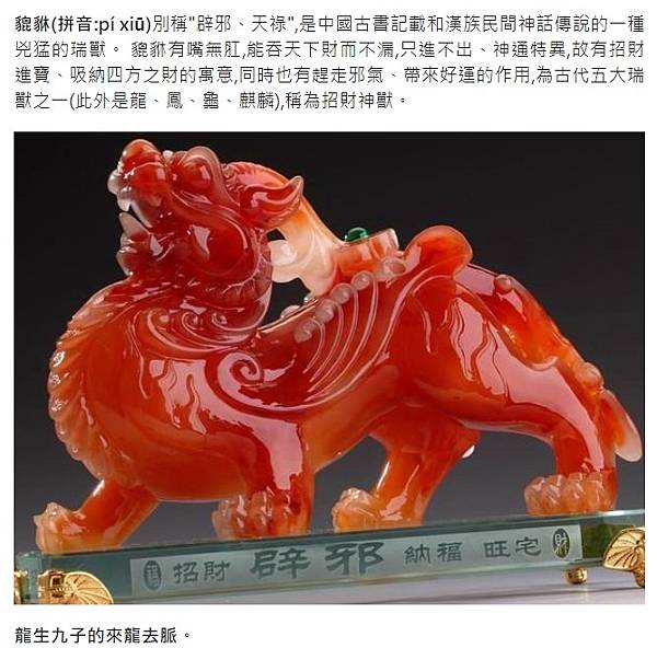 貔貅(拼音:pí xiū)別稱"辟邪、天祿",是中國古書記載和漢族民間神話傳說的一種兇猛的瑞獸。 貔貅有嘴無肛,能吞天下財而不漏,只進不出、神通特異,故有招財進寶、吸納四方之財的寓意,同時也有趕走邪氣、帶來好運的作用,為古代五大瑞獸之一(此外是龍、鳳、龜、麒麟),稱為招財神獸。