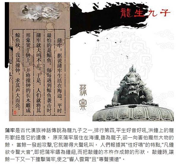 蒲牢是古代漢族神話傳說為龍九子之一,排行第四,平生好音好吼,洪鐘上的龍形獸鈕是它的遺像。 原來蒲牢居住在海邊,雖為龍子,卻一向害怕龐然大物的鯨。 當鯨一發起攻擊,它就嚇得大聲吼叫。 人們報據其"性好鳴"的特點,"凡鐘欲令聲大音",即把蒲牢鑄為鐘紐,而把敲鐘的木杵作成鯨的形狀。 敲鐘時,讓鯨一下又一下撞擊蒲牢,使之"響入雲霄"且"專聲獨遠"。