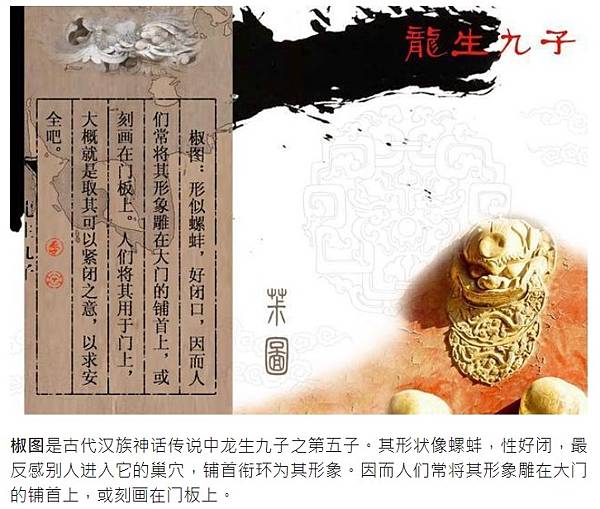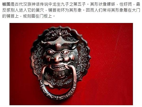 椒圖是古代漢族神話傳說中龍生九子之第五子。 其形狀像螺蚌,性好閉,最反感別人進入它的巢穴,鋪首銜環為其形象。 因而人們常將其形象雕在大門的鋪首上,或刻畫在門板上。