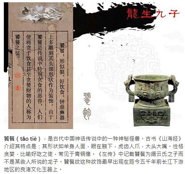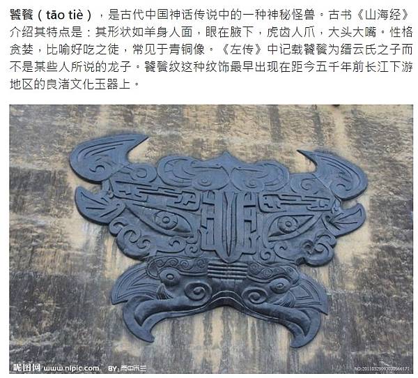 饕餮(tāo tiè),是古代中国神话传说中的一种神秘怪兽。古书《山海经》介绍其特点是:其形状如羊身人面,眼在腋下,虎齿人爪,大头大嘴。性格贪婪,比喻好吃之徒,常见于青铜像。《左传》中记载饕餮为缙云氏之子而不是某些人所说的龙子。饕餮纹这种纹饰最早出现在距今五千年前长江下游地区的良渚文化玉器上。