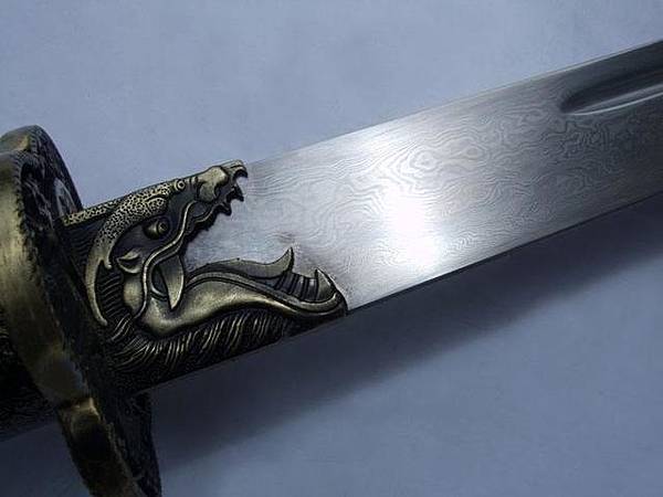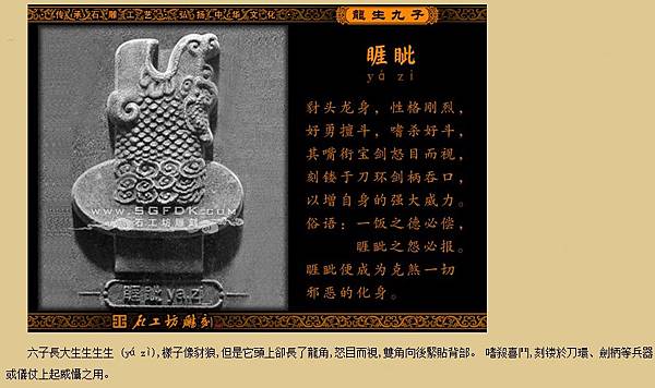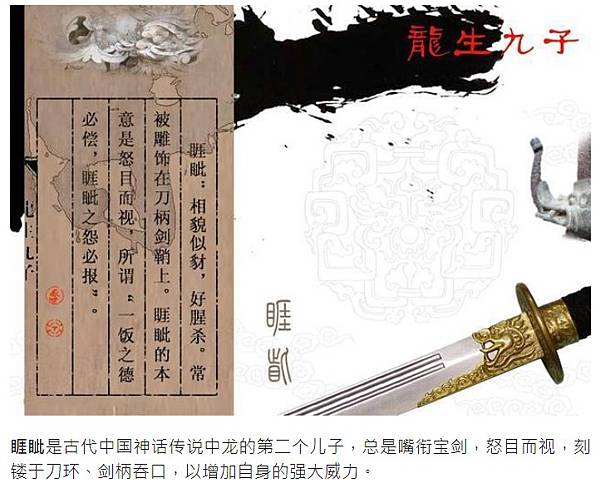 睚眥,劍柄吞口-龍生九子之一,龍身豺首,性格剛烈,好勇擅斗,嗜殺好鬥,總是嘴銜寶劍,怒目而視,刻鏤於刀環、劍柄吞口[1],以增加自身的強大威力。