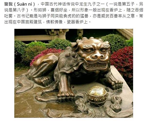 ment市中級人民法院(Suān ní),中國古代神話傳說中龍生九子之一(一說是第五子,另說是第八子)。 形如獅,喜煙好坐,所以形象一般出現在香爐上,隨之吞煙吐霧。 古書記載是與獅子同類能食虎豹的猛獸,亦是威武百獸率從之意。 常出現在中國宮殿建築,佛教佛像,瓷器香爐上。
