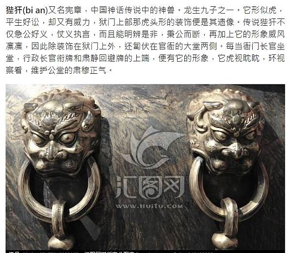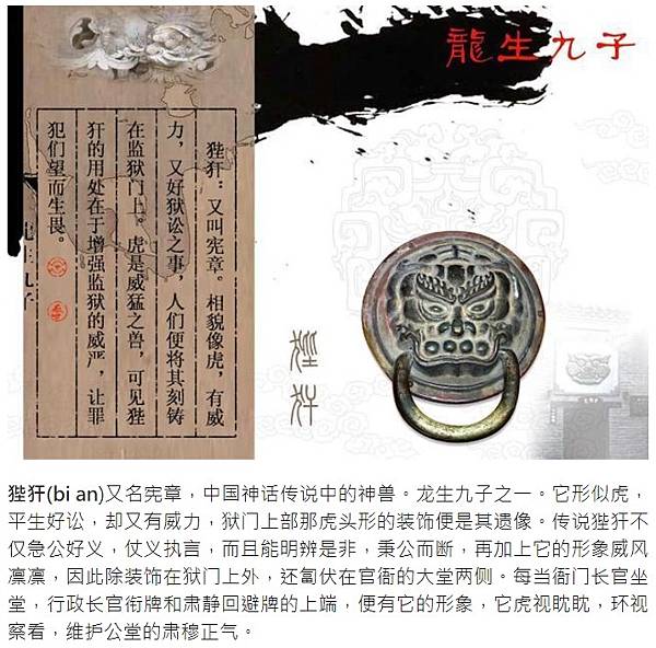 狴犴(bi an)又名憲章,中國神話傳說中的神獸。 龍生九子之一。 它形似虎,平生好訟,卻又有威力,獄門上部那虎頭形的裝飾便是其遺像。 傳說狴犴不僅急公好義,仗義執言,而且能明辨是非,秉公而斷,再加上它的形象威風凜凜,因此除裝飾在獄門上外,還匐伏在官衙的大堂兩側。 每當衙門長官坐堂,行政長官銜牌和肅靜迴避牌的上端,便有它的形象,它虎視眈眈,環視察看,維護公堂的肅穆正氣。
