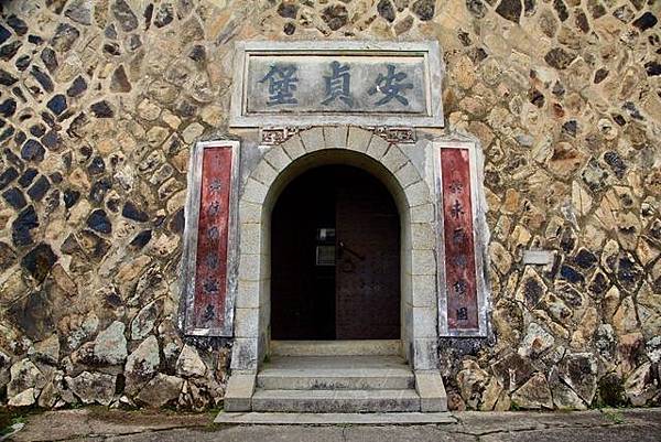 安貞堡造型,前部呈方形,後部為半圓。堡之正門,為高丈餘的拱形大門,上方刻有「安貞堡」三個大字,兩旁一副藏頭聯曰:「安於未雨綢繆固,貞觀沐風謐靜多。」「安貞」二字,出自《周易》中「安貞之吉,應地無疆」,寓吉祥、安定、祥和之意。既祈居安思危,又禱國泰民安。為了增強防禦功能,正門有前後兩重,前重是兩扇六七寸厚的木板門,後重是一道堅硬的大鐵門。正門頂端,設有兩處灌水孔,用以防範火攻。