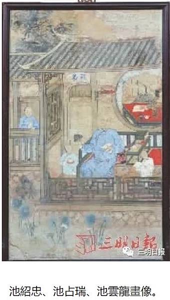 紹忠公(聖篤公之子)和池占瑞(紹忠公之子)、池雲龍的畫像。 池仁升介紹,此圖以景雲堂廂房為背景,展示他們在讀書、思考的畫面,體現了池氏家族世代書香門第。