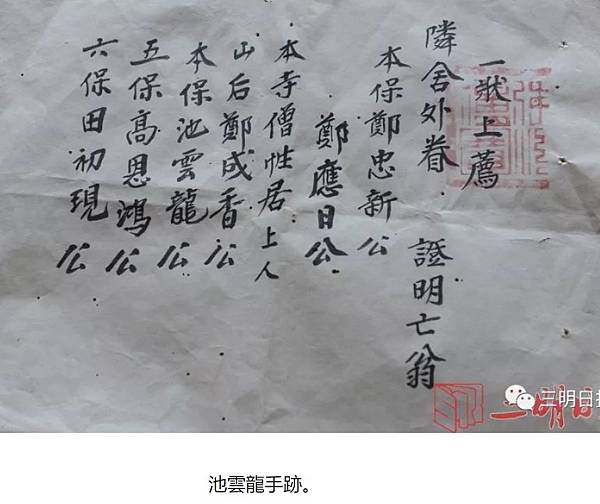 手跡:安貞堡內的窗雕、對聯等多處留有池雲龍手跡,但是文書類手跡,系第一次發現。 手跡內容為鄰村一位老人的死亡證明,由於只保存了最後一頁,難以知曉具體內容。 現存手跡具體內容為:「一狀上薦,鄰舍外眷,證明亡翁。 本保:鄭忠新公、鄭應日公,本寺僧性居上人,山後鄭成香公,本保池雲龍公,五保高恩鴻公,六保田初現公。 "池善耀介紹,"山後、五保、六保"系現在大田縣建設鎮的和平村、建豐村、建國村、建樂村區域,"本寺"系位於西華洋尾村的福壽寺,"文革"期間破"四舊"時被拆除。 "本保池雲龍公"字雖少,卻是安貞堡發現的重要文獻。