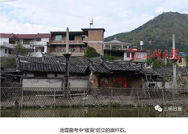 池雲龍考中"拔貢"而立的一對旗杆石。 位於池氏營坪祖祠進興堂門口,旗燭鬥字為「恩光梓里」「重楓宸典」,旗杆底座正面刻有「光緒乙酉科」"拔貢候選知府池雲龍立"。