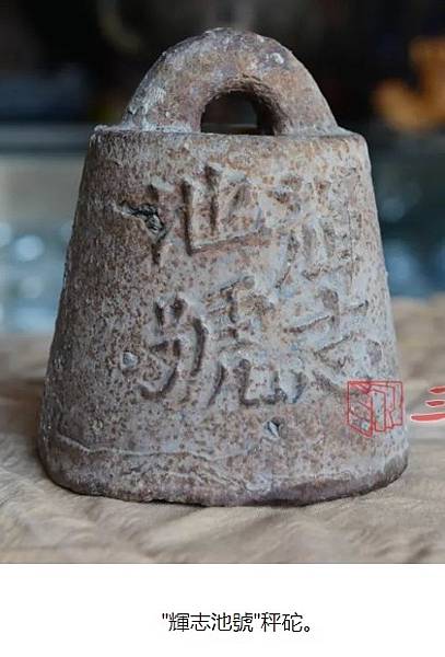 秤砣:鑄鐵,圓錐形,錐底直徑13釐米、錐高16釐米、重6.5千克,頂上有半月形掛鉤,錐體刻有"輝志池號",輝志系聖篤公的字。 池善耀說,當年一般家庭沒有這麼大的秤砣,此秤砣的秤很大,是當年聖篤公用來稱牛皮、茶葉、香菇等貨物。