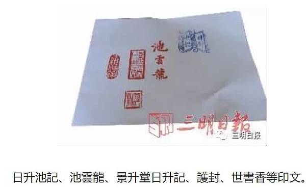 "護封"印:木製,梯形,底面正方形2.5釐米×2.5釐米,高3釐米,頂面正方形2釐米×2釐米;篆書,朱文,四周留邊。 池仁升說,此印類似於現在的封條,先祖在福建各地經商,時常有信件、物品往返,在封口蓋上此印,避免被人拆封,也可檢驗信件、物品是否安全。