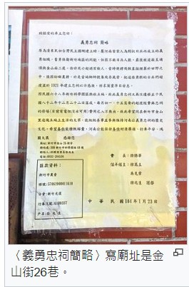 〈義勇忠祠簡略〉寫廟址是金山街26巷。