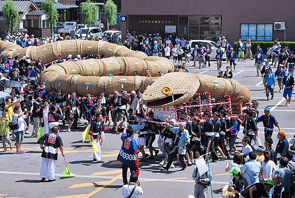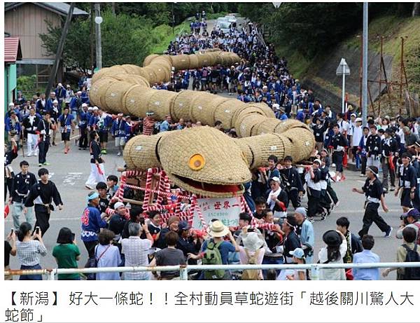 為了警示後世當地曾遭洪害,位在新潟縣北部的關川村自 1988 年開始,每年 8 月下旬都會舉辦「越後關川驚人大蛇節」。村內 54個聚落分工合作,齊心協力製作一條長 82.8公尺、重 2 噸左右的竹藁大蛇。活動當天由500 位居民輪流扛著大蛇步行遊街,最後在關川村公所前,將蛇盤成一團,宣告活動進入尾聲,徹底展現村民團結一致的精神。