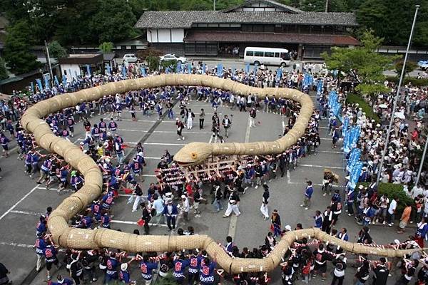 祭典由1988年開始,而今年的祭典將於2019年8月23至25日舉行。祭典的第一天主要舉行安全祈願祭儀式,而第二天便是花火大會和盆舞會。最後一天便是整個祭典的高潮,長82.8公尺、重約2噸的巨蛇在500名村民的努力之下,在大街上靈動地巡遊,最後在關川村公所前盤成一團作為完結。這條巨蛇到底是怎樣練成的?其實便是村內54個聚落一起分工合作,使用草、竹細心地製作而成,果然齊心就事成!