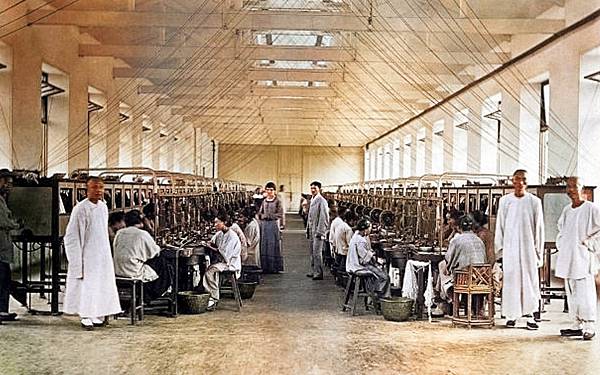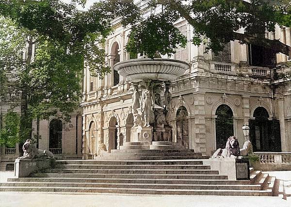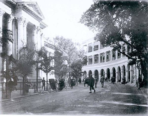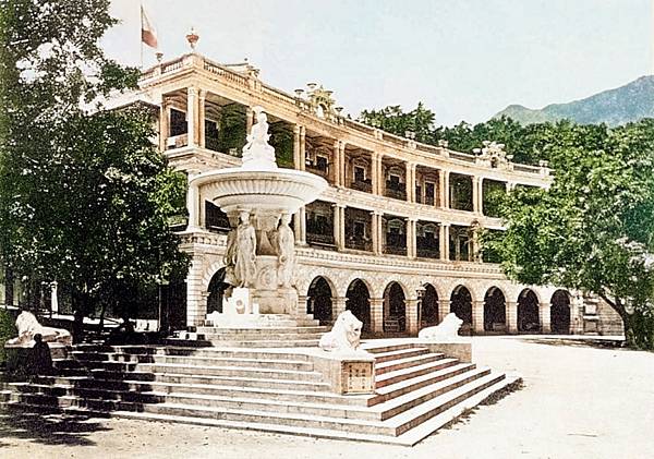 1880s年 近140年前香港風貌 黑白照片AI Colorized色彩可能是最早期香港棉紗工廠。大會堂第一代 柏拱行 顛地噴泉