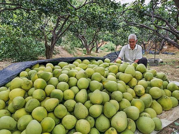 例如,保安宮附近,擁有1000坪柚子園的老農江日權,正趕著採收,綠滋滋的柚子堆成小山。