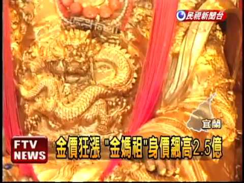 中國時報【梁貽婷/2010-10-09台中縣報導】 國際黃金價格不斷飆漲,台中縣大甲鎮瀾宮供奉的金媽祖身價也水漲船高,五年前,廟方以新台幣約一億兩千萬打造的純金媽祖,現在市價高達三億五千萬元,短短時間,媽祖身價漲幅超過兩億元。