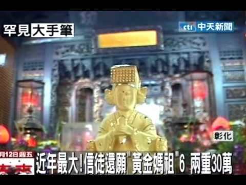 台中縣大甲鎮瀾宮將20多年來信徒捐贈的上萬面金牌,鎔鑄之後打造了一尊純黃金的媽祖神像,重量是7200兩,也就是260公斤,價值1億2千萬,這是全台灣最大的純黃金媽祖神像,鎮瀾宮的保全措施,可謂滴水不漏。 這是大甲鎮瀾宮打造的純金天上聖母媽祖神像,高4呎2,是20多年來信眾捐贈的上萬面金牌鎔鑄之後重新打造,光輝燦爛,通體發亮,相當耀眼,這尊神像是實心的,足足有7200兩重,換算之後有260公斤,光是聖母頭冠就有5公斤重,女記者拿了之後也不禁手軟。媒體記者:「哇...真得很重。」 打造這尊純金媽祖神像的師父說,這是他生平得意之作,無論媽祖的莊嚴的法相,細緻的衣服紋飾波浪,一年來讓他再三精雕細琢,不過這麼貴重的東西,心理壓力也很大。鑄金師父柯建華:「一整年不敢回家睡覺,我要守在這裡。」 大甲鎮瀾宮表示,為了保護尊櫃的媽祖神像周全,除了連線保全,防彈玻璃護衛金身外,所有看不到的地方,都有電眼監看。鎮瀾宮副董事長鄭銘坤:「這個角落都有(電眼),角落也有。」 前來參拜的信眾,今天因緣際會有幸能夠親手撫摸媽祖金身,每個人都樂得眉開眼笑,這尊價值1億2千多萬的黃金媽祖,就位在大甲鎮瀾宮地下室的媽祖博物館,元宵節啟用,廟方歡迎全省信眾共同前來參拜