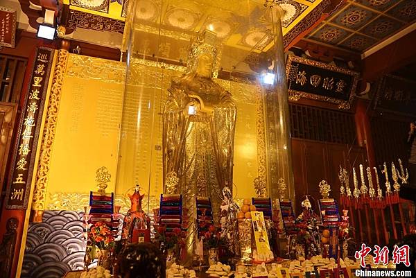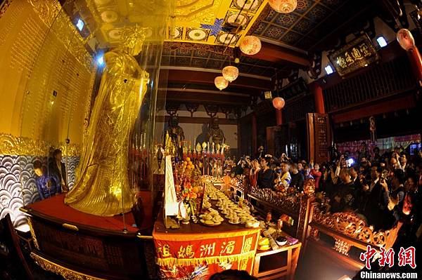 4月11日,全球最大黃金媽祖像開光典禮在「媽祖故里」福建莆田湄洲祖廟順濟殿舉行。當天,包括百家台灣宮廟在內的兩岸近千家媽祖宮廟3000餘名信眾齊聚湄洲島共同禮拜媽祖。該尊黃金媽祖像由兩岸鑄造專家耗時278個工日共鑄而成,高3.23米、重323公斤,寓意媽祖三月廿三出生,價值1億多元人民幣,為全球最大最重的黃金媽祖像。該尊媽祖金像開光之後安奉在湄洲媽祖祖廟順濟殿,作為鎮廟之寶供信眾永久朝拜。李南軒 攝