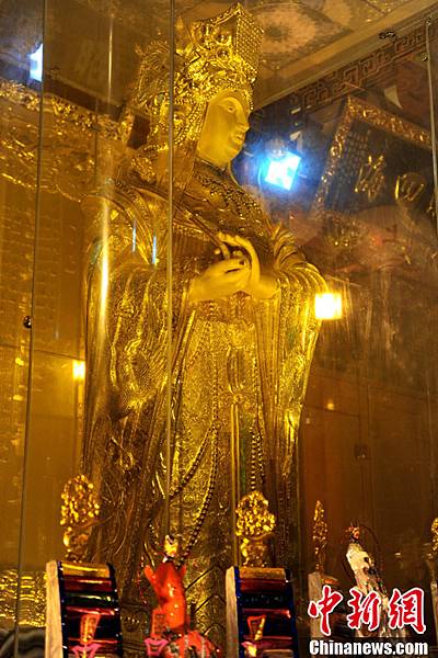 4月11日,全球最大黃金媽祖像開光典禮在"媽祖故裡"福建莆田湄洲祖廟順殿舉行。 當天,包括百家台灣宮廟在內的兩岸近千家媽祖宮廟3000餘名信眾齊聚湄洲島共同禮拜媽祖。 該尊黃金媽祖像由兩岸鑄造專家耗時278個工日共鑄而成,高3.23米、重323公斤,寓意媽祖三月廿三出生,價值1億多元人民幣,為全球最大最重的黃金媽祖像。 該尊媽祖金像開光之後安奉在湄洲媽祖祖廟順濟殿,作為鎮廟之寶供信眾永久朝拜。4月11日,全球最大黃金媽祖像開光典禮在“媽祖故里”福建莆田湄洲祖廟順濟殿舉行。當天,包括百家台灣宮廟在內的兩岸近千家媽祖宮廟3000余名信眾齊聚湄洲島共同禮拜媽祖。該尊黃金媽祖像由兩岸鑄造專家耗時278個工日共鑄而成,高3.23米、重323公斤,寓意媽祖三月廿三齣生,價值1億多元人民幣,為全球最大最重的黃金媽祖像。該尊媽祖金像開光之後安奉在湄洲媽祖祖廟順濟殿,作為鎮廟之寶供信眾永久朝拜