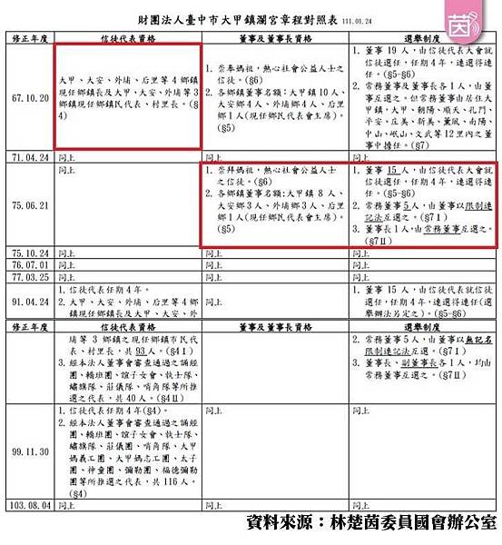 林楚茵表示,根據內政部提供的組織章程對照表,明確揭露:首先,在2002年之前,董事須由信徒代表中選任,且信徒代表必須設籍在「大甲、大安、外埔和后里」;但顏清標在1998至2002年期間,擔任的是「龍井、大肚和烏日」的台中縣議員,隔年(1999年)才當上鎮瀾宮董事長。