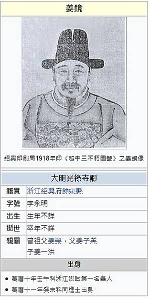 《南疆逸史》:姜一洪字開初,號光陽;餘姚人。 萬曆丙辰進士。 歷職禮、戶二部員外郎,轉郎中;出守江西。 遷河南兵備,分巡汴梁。 時流寇分犯河北,一洪設法防禦;葉縣、鄢陵、彰德、懷慶千里之內,賴之以安。 敘功,擢福建按察使,轉廣東布政使左參議。 累著政績,遷太僕卿。