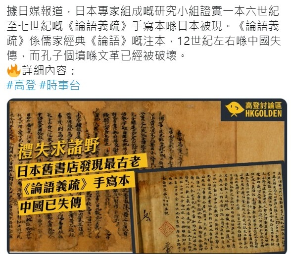 據日媒報道,日本專家組成嘅研究小組證實一本六世紀至七世紀嘅《論語義疏》手寫本喺日本被現。《論語義疏》係儒家經典《論語》嘅注本,12世紀左右喺中國失傳,而孔子個墳喺文革已經被破壞。