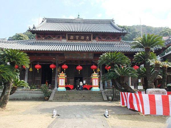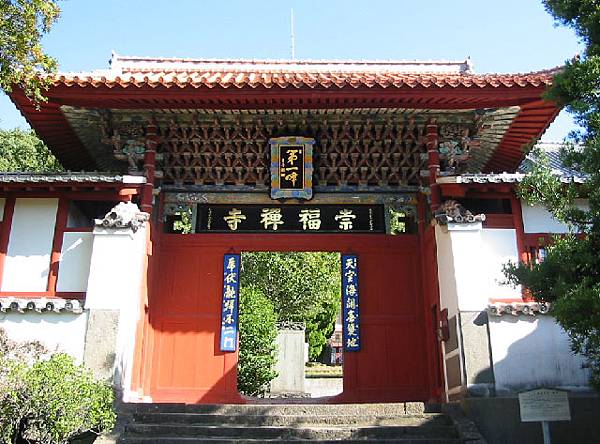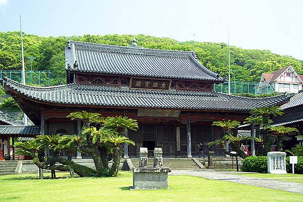 崇福寺。1629年 (寬永六年),長崎的福州籍華僑幫群領袖為了同鄉聯誼和表明宗教信仰,由施主林楚玉、何高材、林仁兵衛等發起,於高野平鄉建立該寺。除大雄寶殿外,該寺還陸續興建了山門、護法堂、媽祖堂、開山堂、鐘鼓樓、方丈室、齋堂等,是一座配套十分完整的佛寺。進入山門後,其左側為第一峰門,建於1644年,門楣上有“崇福禪寺”橫匾,為當年唐通事、該寺主要施主之一的林仁兵衛所書。此門今已被定為日本“國寶”。該寺主殿堂大雄寶殿亦為日本國寶,其右側即是媽祖堂門和媽祖堂 (一般的媽祖廟是很少建堂門的)。每年媽祖誕辰時,崇福寺都要舉行盛大慶典。此外,該寺還附設有書院、唐人墓地等文化與慈善機構。該寺至今保存完好,亦堪稱奇跡。(38)