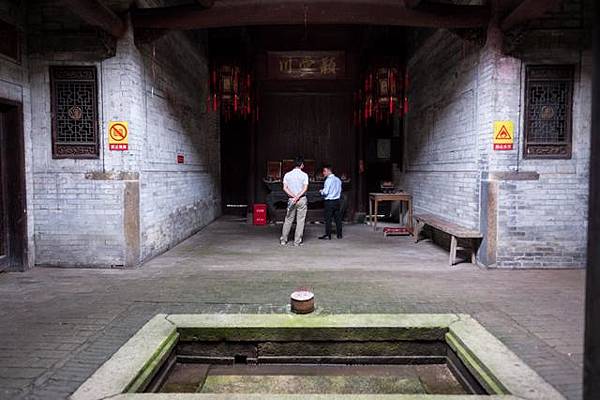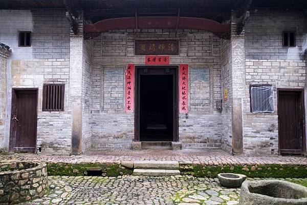 穿過大門而入可到大廳,天井為石頭鋪砌而成,經歷風雨石面上布滿了青苔,這裡建有二口水井,不過在1958年時被填平。望向大廳方向,可看到門匾上的四個大字「清輝朗潤」,仔細看兩側還有磚雕文字。